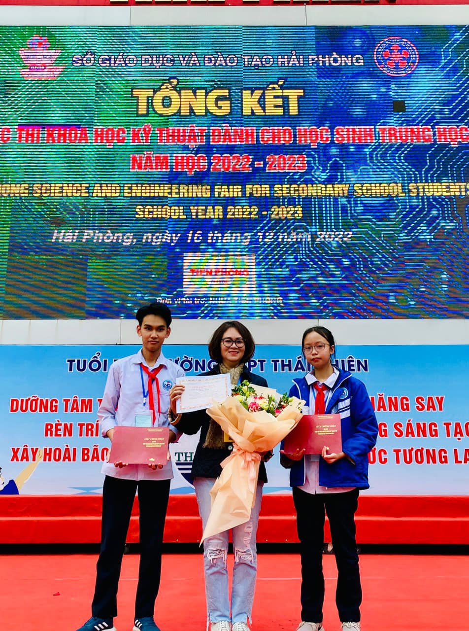 lĩnh vực Hoá Sinh do cô giáo Nguyễn Thị Cẩm Linh hướng dẫn 02 học sinh Nguyễn Tuấn Hưng và Lê Khánh Vy lớp 9A5 thực hiện. Tại Hội thi, các em đã bình tĩnh, tự tin thuyết trình trước các thành viên Ban giám khảo là những nhà khoa học hàng đầu của thành phố và quốc gia về ý tưởng, cách thức, biện pháp thực hiện dự án. Kết quả 2 em đã xuất sắc đoạt giải Tư trong cuộc thi Khoa học kĩ thuật cấp thành phố.