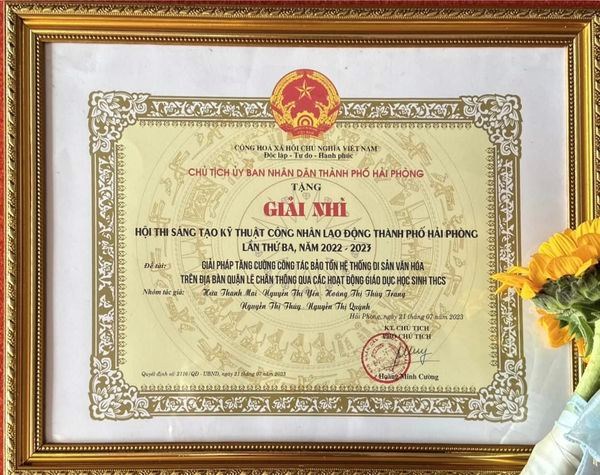 Tập thể giáo viên trường THCS Ngô Quyền gồm các thầy cô: Hứa Thanh Mai, Nguyễn Thị Yến, Nguyễn Thị Thuý, Hoàng Thị Thuỳ Trang, Nguyễn Thị Quỳnh Phương vinh dự đoạt giải Nhì của Hội thi với trị giá giải thưởng 32.000.000 đồng với đề tài nghiên cứu "Giải pháp tăng cường công tác bảo tồn hệ thống di sản văn hoá trên địa bàn quận Lê Chân thông qua các hoạt động giáo dục học sinh THCS".