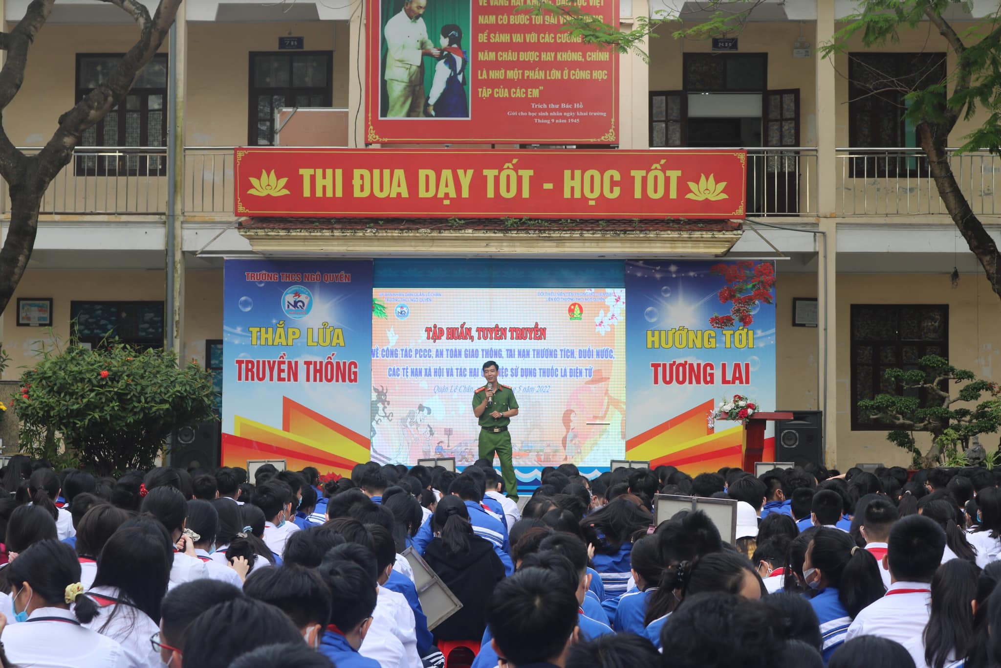 Căn cứ vào kế hoạch liên ngành về công tác Đội và phong trào Thiếu nhi năm 2022 của Quận Đoàn, Phòng GD & ĐT quận Lê Chân về các giải pháp bảo vệ và chăm sóc, giáo dục Thiếu niên; tuyên truyền về PCCC, an toàn giao thông, tai nạn thương tích, đuối nước, các TNXH và tác hại của việc sử dụng thuốc lá điện tử trẻ em; ngày 16/5/2022 Trường THCS Ngô Quyền phối kết hợp cùng Đội Cảnh sát PCCC &CNCH - Công an quận Lê Chân tổ chức buổi TẬP HUẤN, TUYÊN TRUYỀN VỀ CÔNG TÁC PCCC, AN TOÀN GIAO THÔNG, TAI NẠN THƯƠNG TÍCH, ĐUỐI NƯỚC, CÁC TỆ NẠN XÃ HỘI VÀ TÁC HẠI CỦA VIỆC SỬ DỤNG THUỐC LÁ ĐIỆN TỬ cho HS toàn trường…