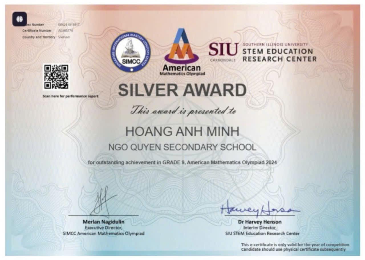 Với tình yêu đặc biệt dành cho môn Toán và tinh thần quyết tâm cao, ngày 27/10/2024 vừa qua, Anh Minh cùng tất cả thí sinh Hải Phòng đã trực tiếp tham dự kì thi cuộc thi Toán Quốc tế American Math Olympiad (AMO) tại trường Đại học Hàng Hải. Vượt qua rất nhiều thí sinh cùng tham dự, Hoàng Anh Minh, lớp 9A3 đã xuất sắc mang về cho mình thêm 1 tấm HCB danh giá, bổ sung vào bộ sưu tập Huy chương vô cùng ấn tượng của em. Đó là món quà vô giá, là phần thưởng xứng đáng động viên tinh thần cho mọi nỗ lực, quyết tâm của Anh Minh trong hành trình chinh phục đỉnh cao tri thức của mình.