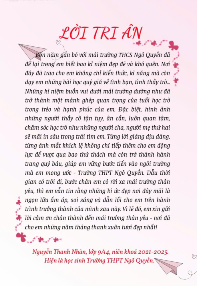Sau bốn năm học tập, rèn luyện dưới mái trường THCS Ngô Quyền thân yêu, khi phải chia xa, trong mỗi học trò đều xốn xang bao cảm xúc, hơn cả là sự lưu luyến, nhớ nhung bè bạn, thầy cô! Đó là LỜI TRI ÂN, lòng biết ơn chân thành, sâu nặng! Fanpage của trường xin được chia sẻ những tình cảm trân quý ấy của các bạn học sinh niên khoá 2021 - 2025!