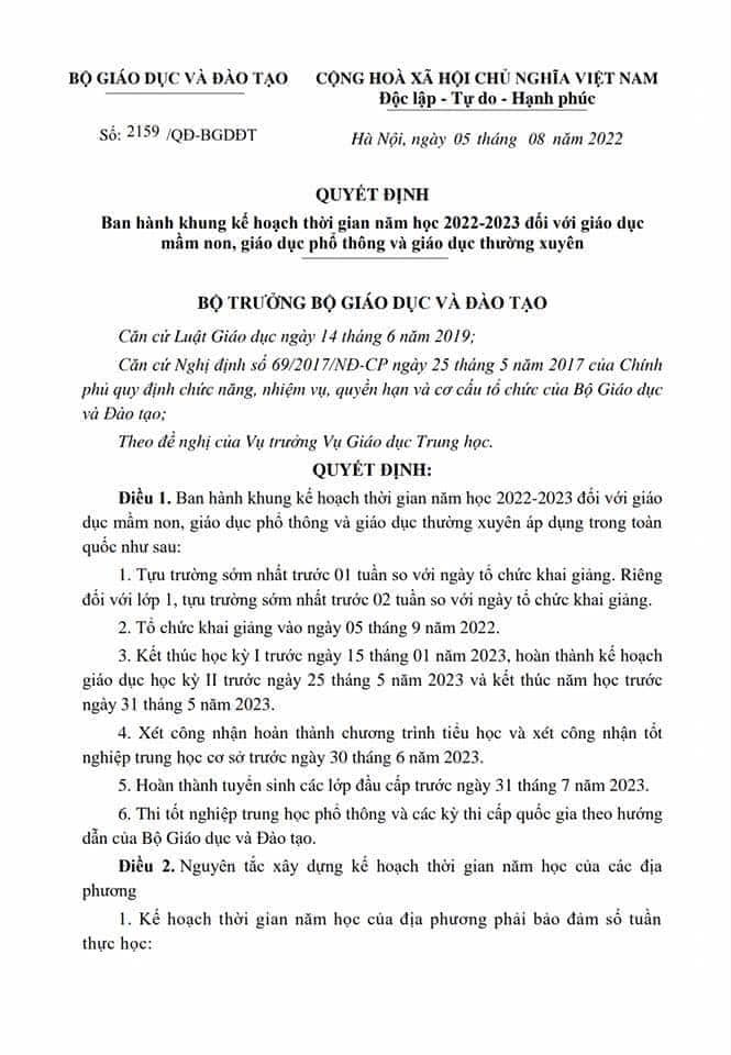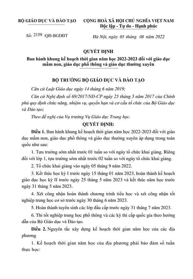 Kính gửi quý thầy cô, các bậc PHHS và các em HS khung Kế hoạch thời gian năm học 2022-2023 đối với GD Mầm non, GD Phổ thông và GD thường xuyên áp dụng trong toàn quốc:
