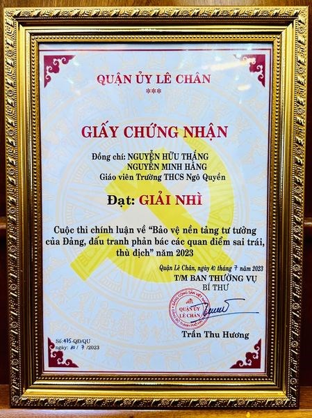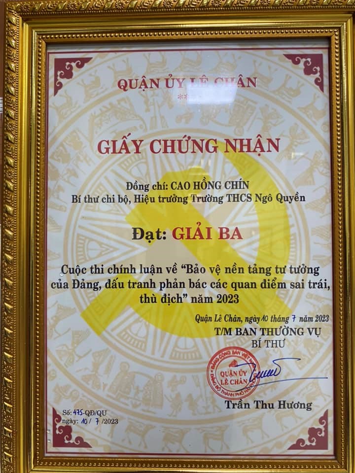 - 01 giải Ba cho tác phẩm “ Quận Lê Chân chăm lo cho sự nghiệp “ trồng người” thuộc thể loại Tạp chí của cô giáo Cao Hồng Chín, Bí thư chi bộ, Hiệu trưởng nhà trường.