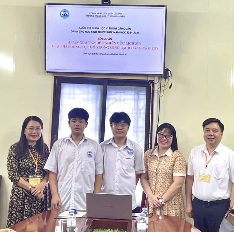 Vừa qua, PDG&ĐT quận Lê Chân đã thông báo kết quả các dự án cuộc thi khoa học kĩ thuật cấp quận dành cho học sinh trung học năm học 2024-2025, trường THCS Ngô Quyền đã đoạt 01 giải Nhất với đề tài" Luận giải vấn đề nghiên cứu Lịch sử: Giải pháp đóng cọc gỗ xuống sông Bạch Đằng năm 1288" của học sinh Nguyễn Phạm Minh Phú lớp 9A6 và Đặng Tiến Đạt lớp 9A6. Đây là đề tài nghiên cứu thuộc lĩnh vực Khoa học xã hội và hành vi dưới sự hướng dẫn khoa học của cô Hứa Thanh Mai - Phó Hiệu trưởng nhà trường.